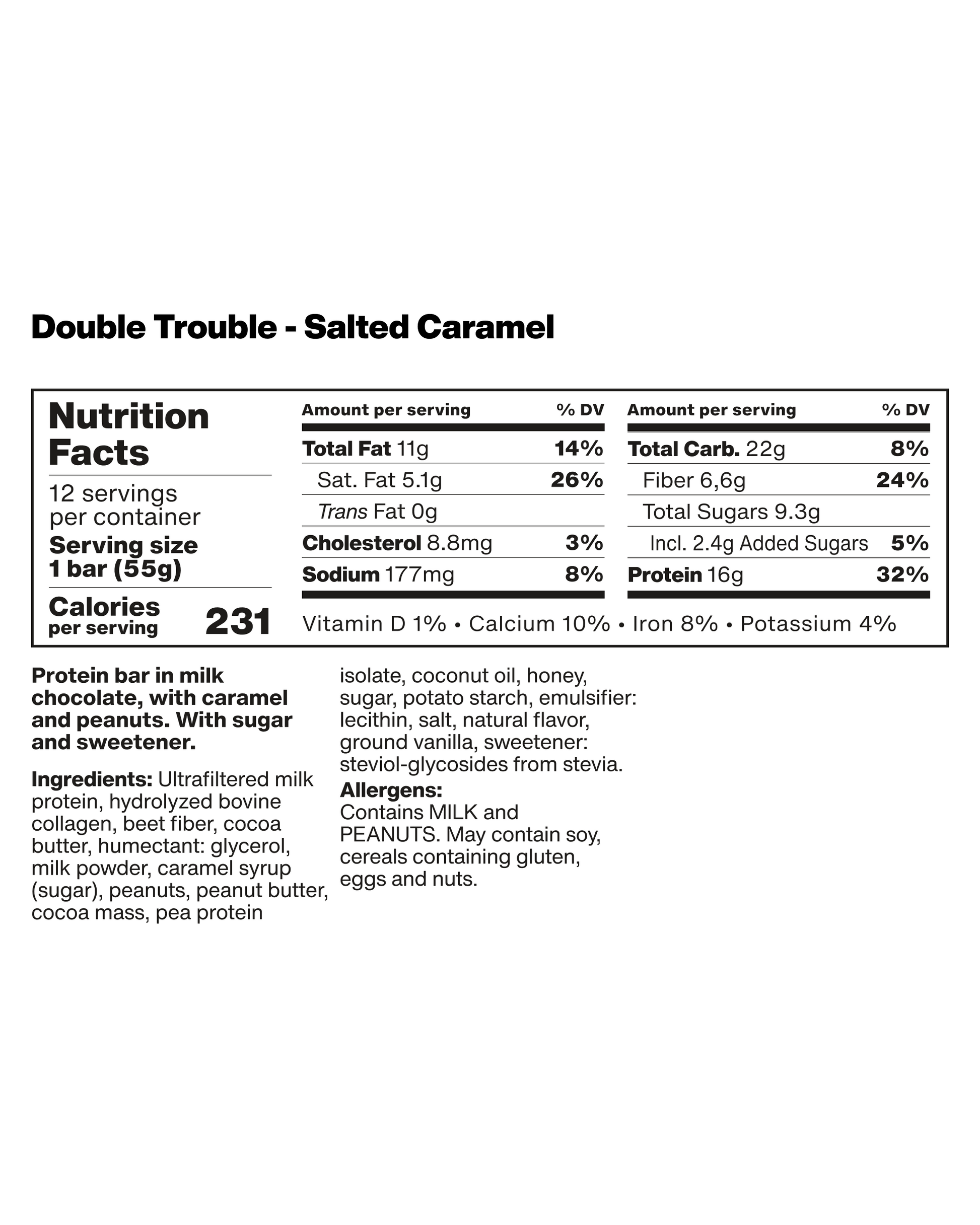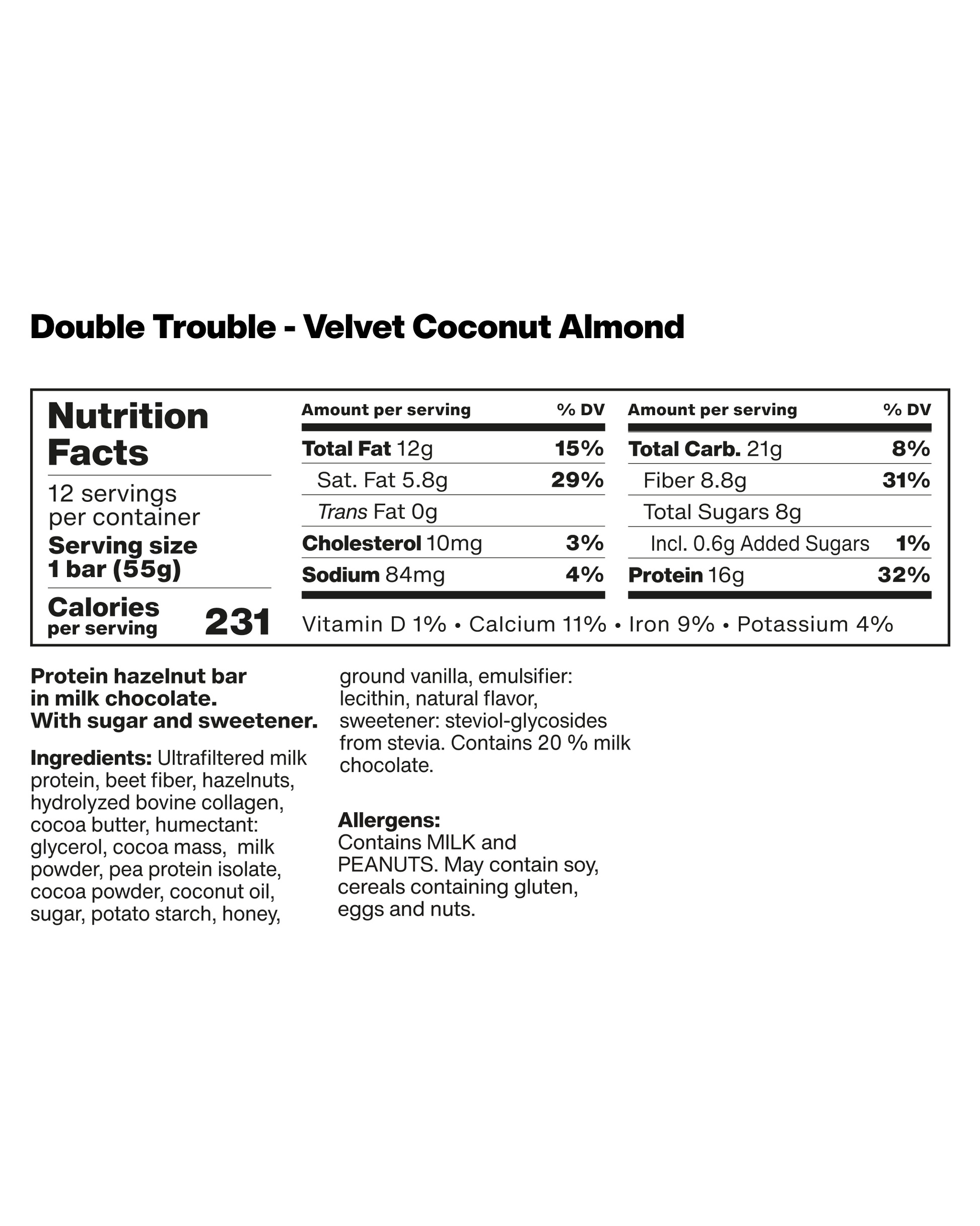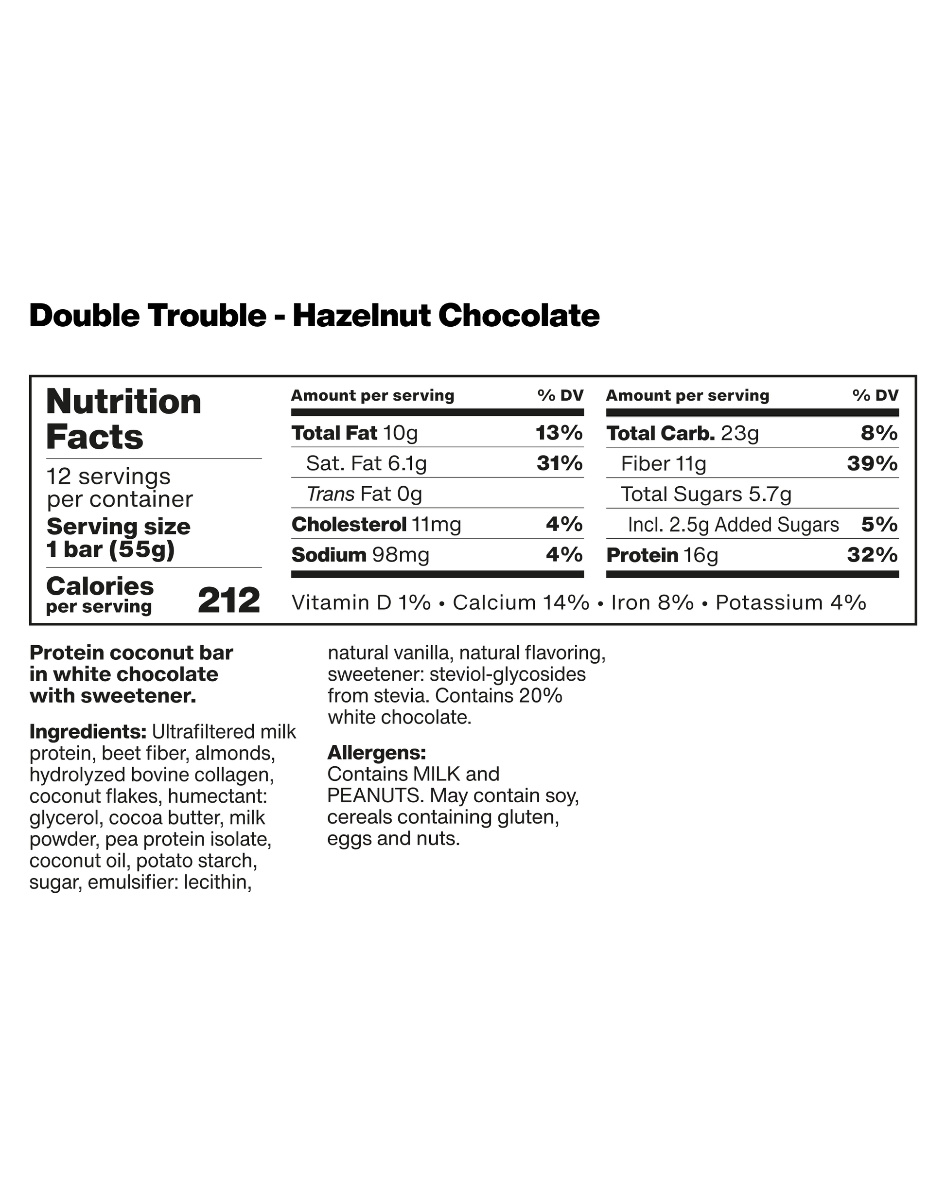 A two-layer, chocolate-covered nut bar packed with 16g of high-quality protein and enriched with collagen peptides, with no preservatives or artificial colors.